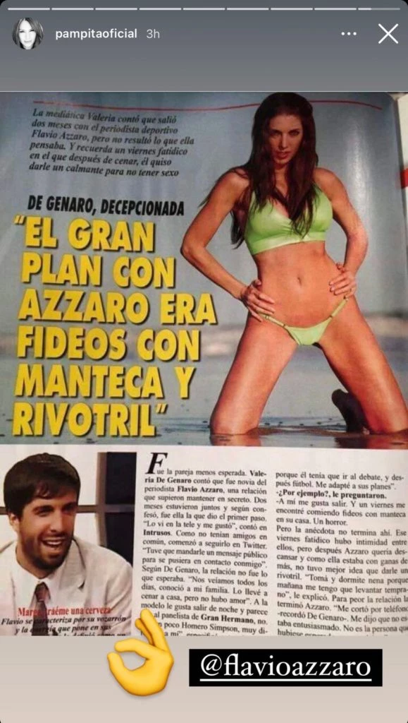 Es por eso que hace pocas horas, Pampita sacó el archivo y, muy inteligentemente, publicó una entrevista que hace unos años le hicieron a Valeria de Genaro, en donde hablaba de las conductas inapropiadas que el periodista tenía durante el tiempo que mantuvieron una breve relación y en donde lo deja muy mal parado. "El gran plan con Azzaro era fideos con manteca y rivotril", dijo.