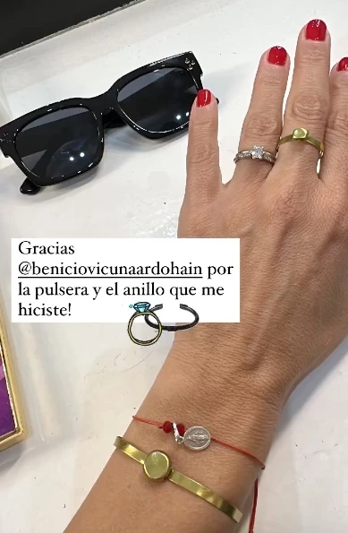 "Gracias Benicio Vicuña por la pulsera y el anillo que me hiciste", agradeció públicamente la modelo en sus redes, mostrando un juego de anillo y pulsera dorada, realizadas en acero quirúrgico. En aquella emisión, Pampita eligió llevar esta especial bijouterie creada por su propio hijo de 8 años.