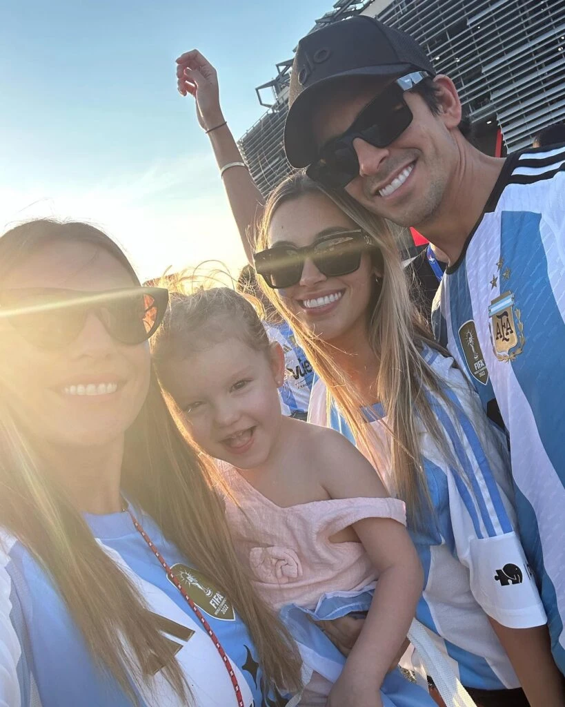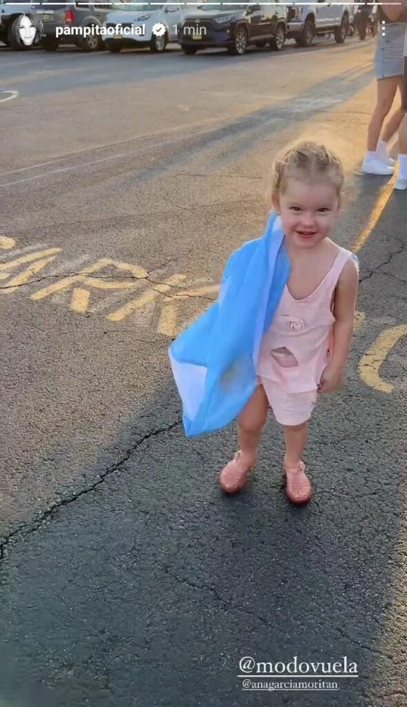 Por su parte, la esposa de Roberto Moritán lució también la camiseta argentina, short negro, zapatillas y unas gafas oscuras, muy canchera para ir a la cancha. Mientras tanto, la pequeña Ana se mostró muy fashionista con un conjunto rosa de remera y short y unas sandalias transparentes rosas con brillos.