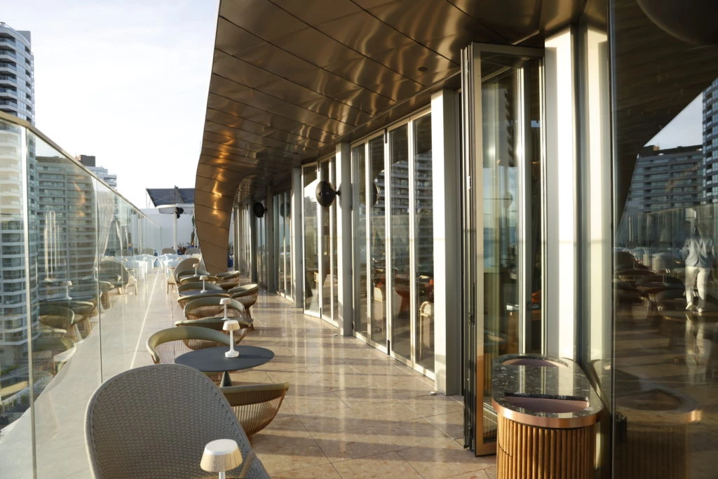 HUMA Rooftop Bar & Lounge, con vista panorámica a la Playa Brava. Se trata de una obra arquitectónica imponente con materiales de última generación como el titanio. Cuenta con una barra circular para disfrutar de un cocktail de autor mirando al mar.