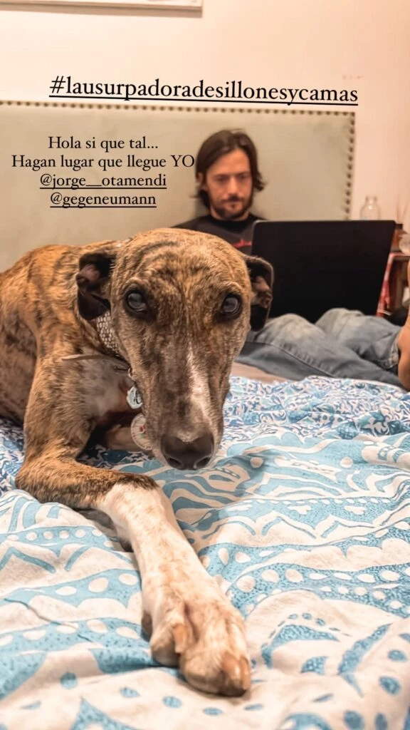 Durante la llegada a su nuevo hogar, Neumann mostró a la perra durmiendo en el sillón, acompañada de su marido, Jorge Otamendi. "Mi nuevo nombre es India y pasé muy bien mi primera noche durmiendo en la cama de Matías", compartió la modelo, en referencia a su hijo de 12 años.