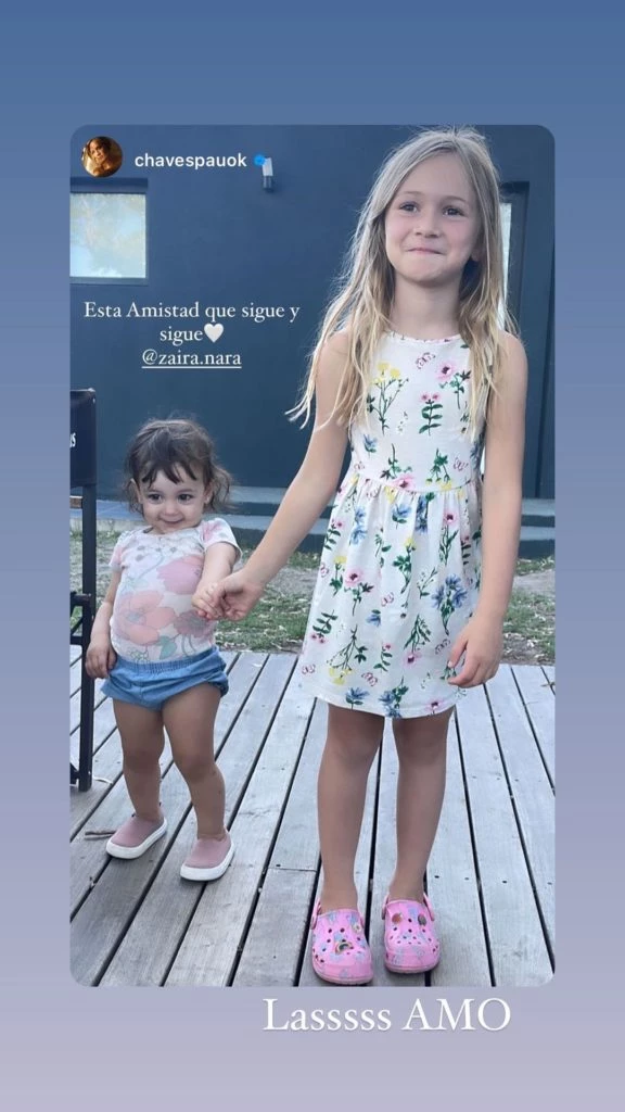 En una tarde de juegos las hijas de Zaira Nara y Paula Chaves, Malaika Von Plessen y Filipa Alfonso posaron felices y sonrientes, agarradas de la mano: "Esta amistad que sigue y sigue", dijo Paula Chaves y arrobó a su amiga Zaira.