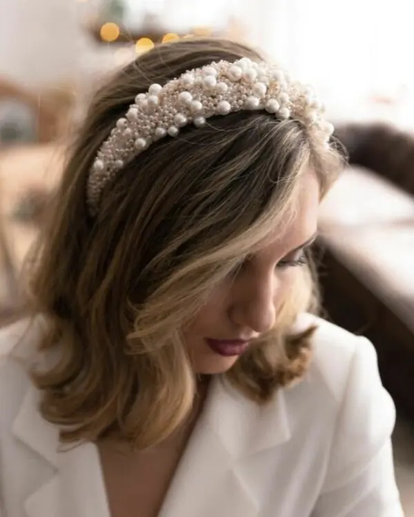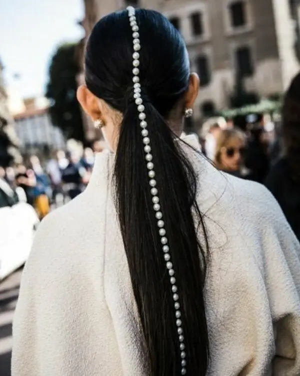 Una opción apta para las más atrevidas que consiste en añadir a uno de tus mechones de pelo una tira con perlas, para luego acomodarla en tu peinado. Podés hacer, como en la imagen, una pony tail baja, haciendo que se destaque el accesorio en la mitad de la cabeza y en el resto del pelo que cae recogido.