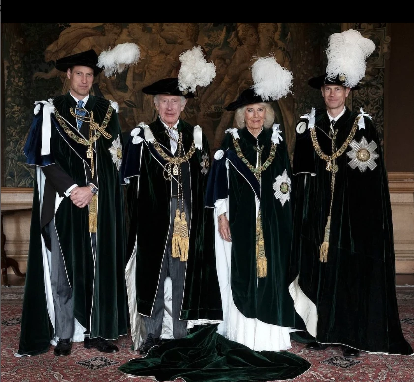 La foto en cuestión fue compartida a través de las redes sociales oficiales de la Familia Real y en ella aparecen los monarcas, así como también el príncipe William y el duque Eduardo de Edimburgo. Todos ellos vestidos con la túnica de terciopelo verde, el sombrero con plumas blancas y demás distintivos de la Orden.