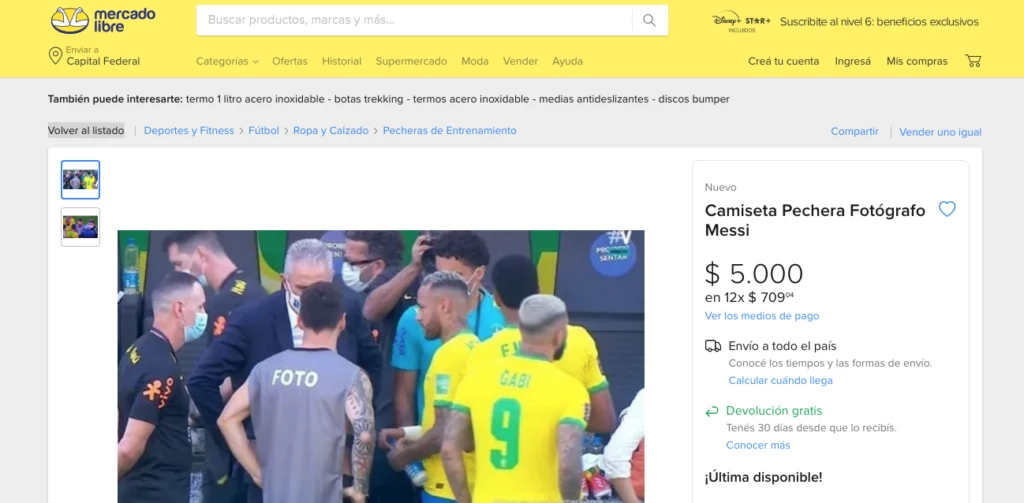 Mientras tanto a media hora de suspenderse el partido, viveza criolla mediante, a algún argentino avezado se le ocurrió poner en venta ya mismo esta pechera de fotógrafo que Messi sacó en la cancha.