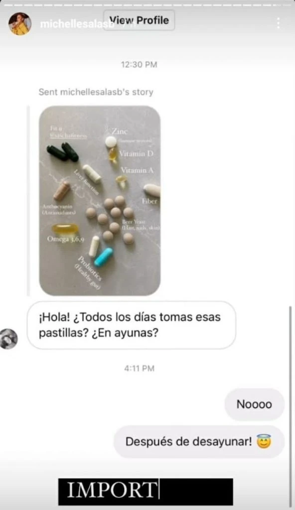 Si bien cada una de las píldoras tiene una función especial y más de “prevención” que de “cura”, la hija de Stephanie Salas no dejó de preocupar a sus fans por someterse a una especie de cóctel peligroso. Así fue que la joven de 31 años de edad mostró cómo una seguidora le preguntaba “Hola ¿Todos los días tomas esas pastillas? ¿En ayunas?”. A lo que Michelle respondió: “Nooo, después de desayunar”, y resaltó que este dato es “importante”.