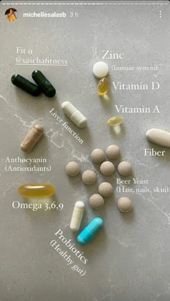 En la segunda de las pics, Michelle ha explicado de qué va cada una. “Zinc, Vitamina A, Vitamina D, función hepática, fibra, antioxidantes, probióticos, Fit 9, beer yeast y Omega 3, 6 y 9”, son solo algunas de las píldoras que mencionó. La levadura Brewer's Yeast es una fuente de vitamina B2 y vitamina B12. Ambas estimulan el metabolismo energético y la reducción del cansancio y la fatiga.