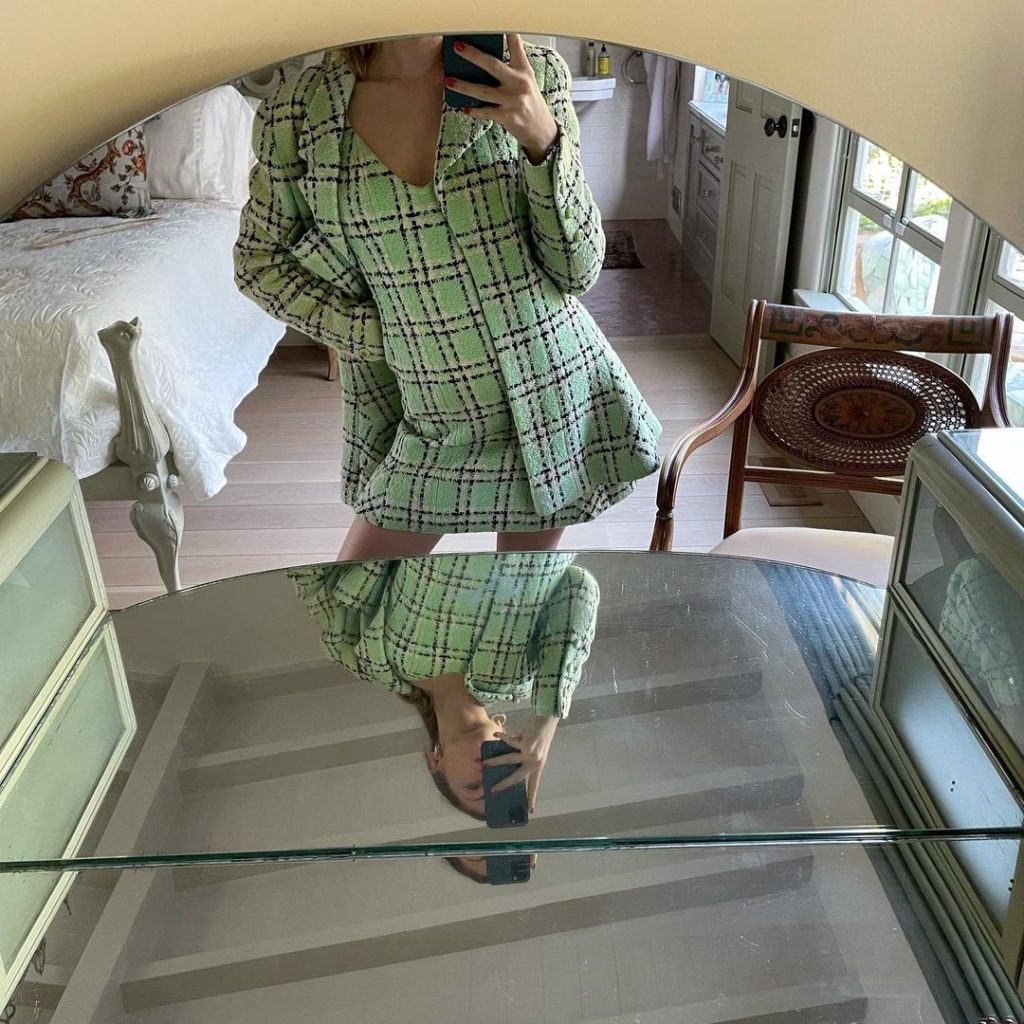 A veces usa looks vintage, como este dos piezas verde estampado de cuadros que nos muestra sin enseñar su rostro, dejando bien claro que para ella lo bohemio no es una tendencia, sino una forma de vida. Mientras que iconos de su generación llenan sus perfiles de looks que las marcas les envían, y que por ello etiquetan pertinentemente, Stella Banderas Griffith únicamente lo hace cuando quiere promocionar firmas o negocios vinculados a sus amigas.