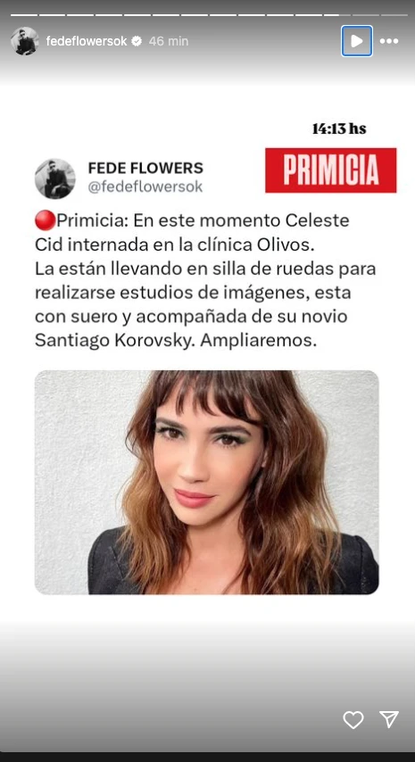 El periodista Fede Flowers informó en exclusiva en sus redes sociales que la actriz Celeste Cid fue internada de urgencia en la Clínica Olivos. Según detalló, la artista fue vista siendo trasladada en silla de ruedas para realizarse estudios de imágenes, mientras permanece con suero y acompañada por su novio, el actor y comediante Santiago Korovsky.