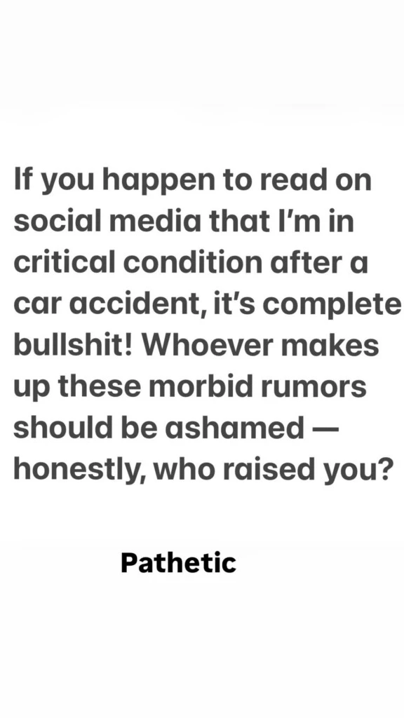 Por medio de Instagram Stories, la mujer expresó su descontento: “If you happen to read on social media that I’m in critical condition after a car accident, it’s complete bullshit! Whoever makes up these morbid rumors should be ashamed — honestly, who raised you? Patetic". (“Si llegás a leer en redes sociales que estoy en estado crítico después de un accidente de auto, ¡es totalmente mentira! Quien invente estos rumores morbosos debería sentir vergüenza — sinceramente, ¿quién te crió? Patético").