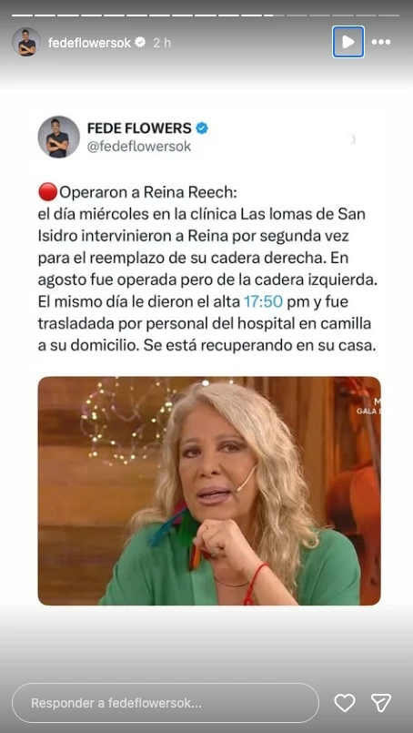 Reina Reech, de 66 años, se sometió a una nueva intervención quirúrgica esta semana y ya se encuentra en proceso de recuperación. La noticia fue confirmada por el periodista Fede Flowers a través de su cuenta oficial de X, donde informó que la artista fue operada el miércoles en la Clínica Las Lomas de San Isidro.