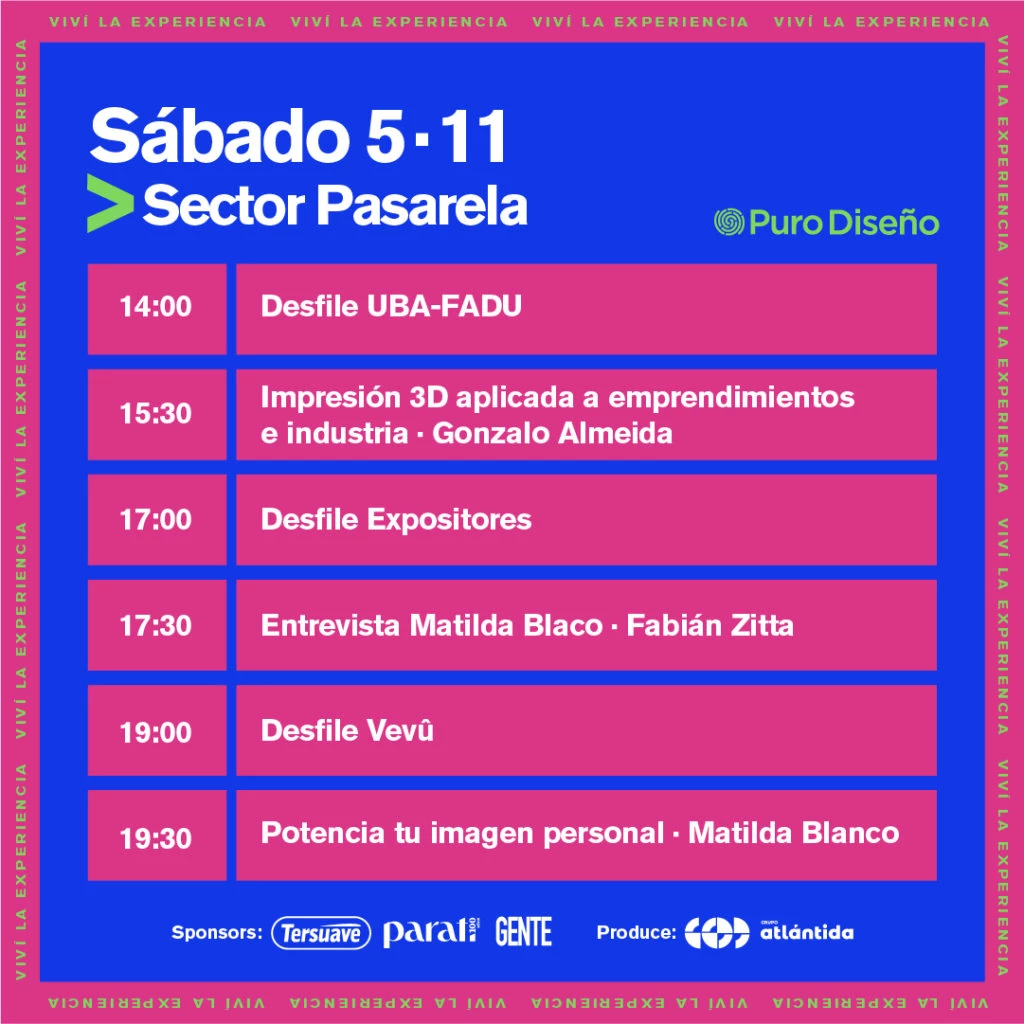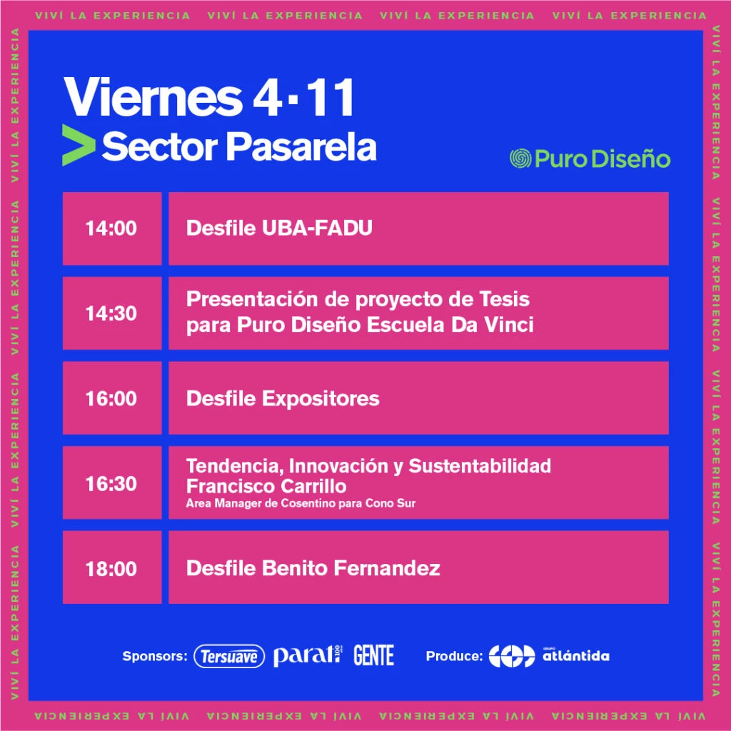 Simultáneamente se estará llevando a cabo una ronda de negocios con CAME (Confederación Argentina de la Mediana Empresa), y a las 14.30, la escuela de arte multimedial Da Vinci presentará su proyecto de tesis para Puro Diseño.