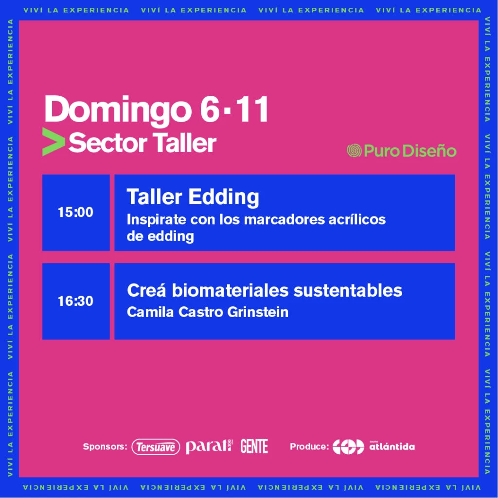 Los talleres de la última jornada para agendar: “Inspirate con los marcadores acrílicos de edding” (a las 15) y “Creá biomateriales sustentables” por Camila Castro Grinstein (a las 16.30).