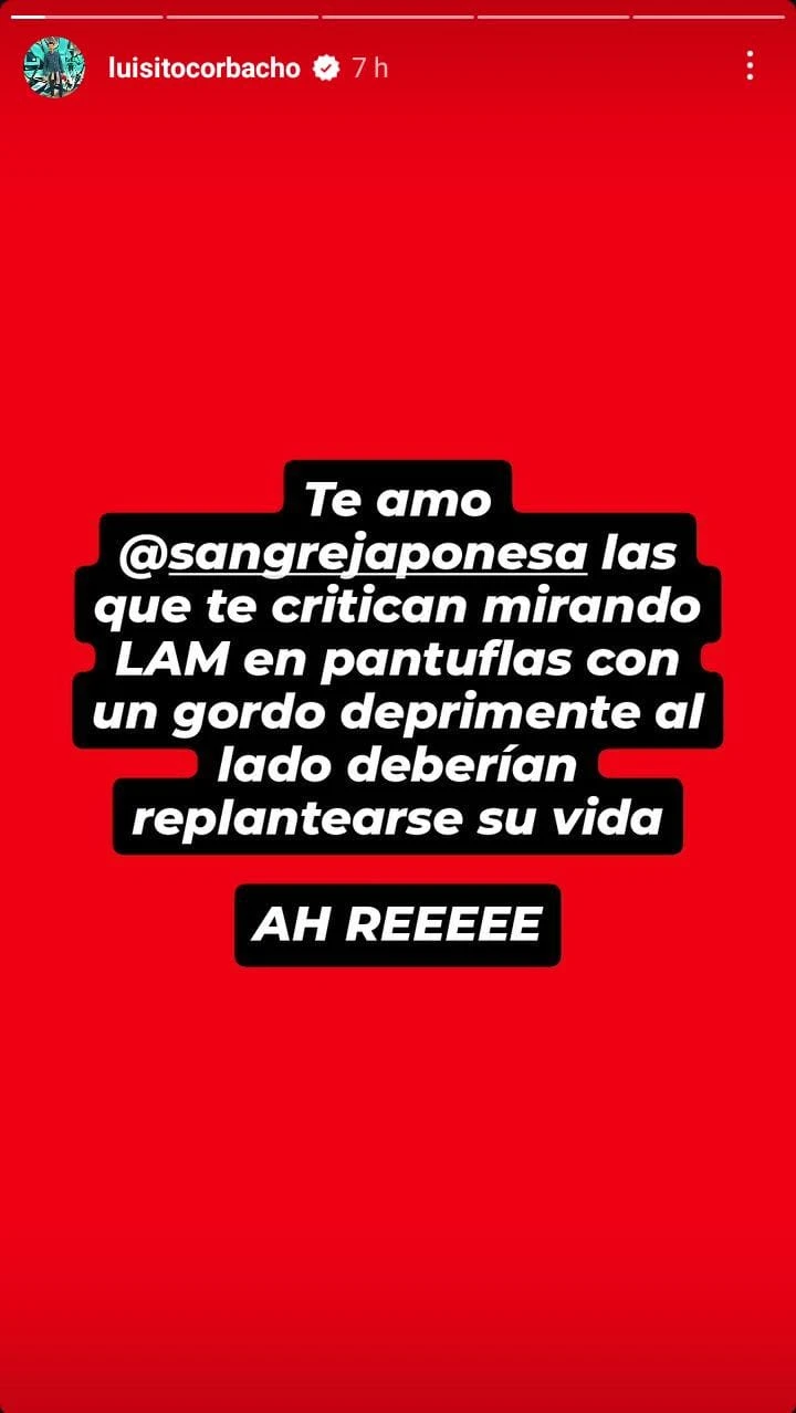 Fue el periodista y escritor Luis Corbacho quien tuvo la palabra de la ex Teen Angel, revelando su postura frente a este escándalo. "Te amo @sangrejaponesa. Las que te critican mirando LAM en pantuflas con un gordo deprimido al lado deberían replantearse su vida", disparó picante.