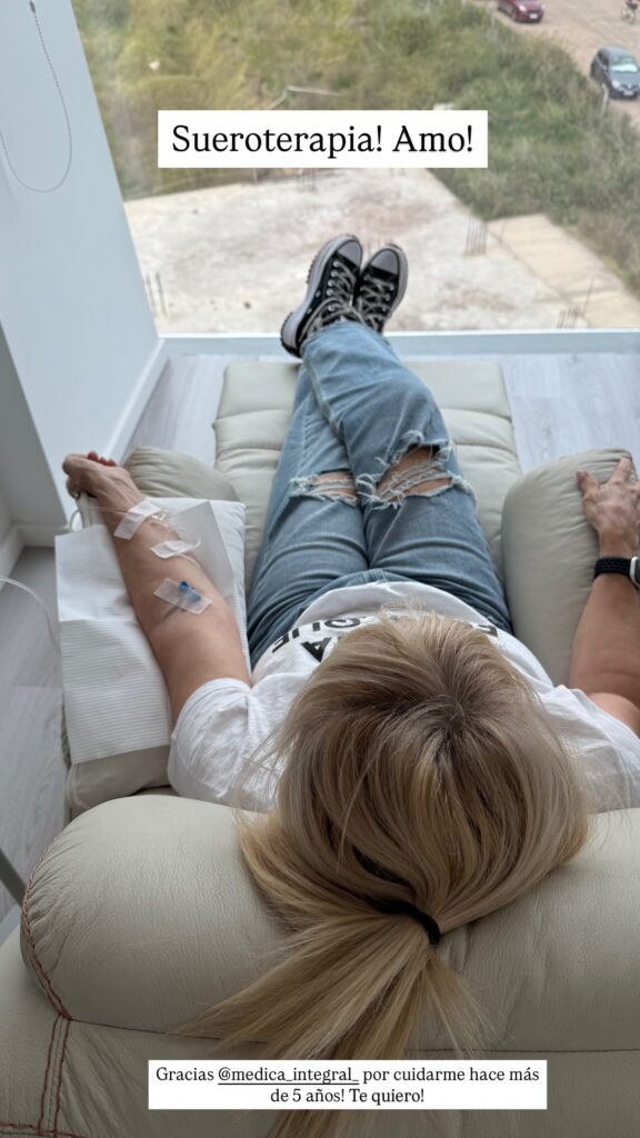 "Sueroterapia! Amo!", escribió la empresaria de 63 años en su posteo, donde además agradece a la empresa de medicina integral que la atiende desde hace 5 años.