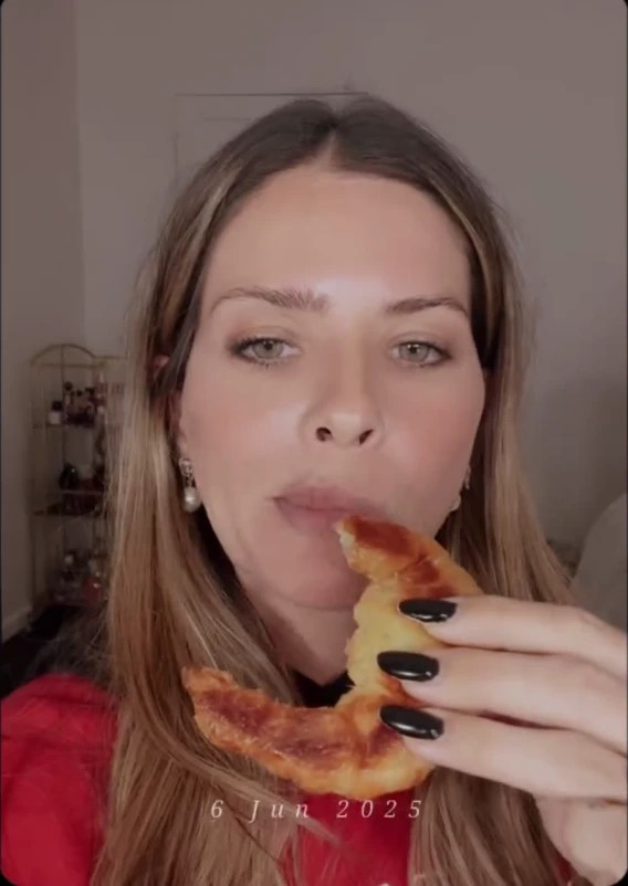 Luego, compartió un video donde aparece comiendo medialunas mientras sus hijos juegan detrás de ella. "Las mejores medialunas del mundo", escribió la actriz, dando cuenta del día y de la hora que era en ese momento.