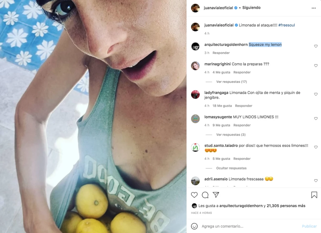 Eso sí, antes de llegar a la cocina de su casona de San Isidro y mientras llevaba la valiosa carga de frutas contenida en su remera musculosa, la nieta de Mirtha Legrand se sacó una selfie y la subió a su cuenta de Instagram. "¡Limonada al ataque!", escribió la actriz y conductora junto a su sugerente fotografía y uno de los primeros en responder fue nada menos que su novio, Agustín Goldenhorn.