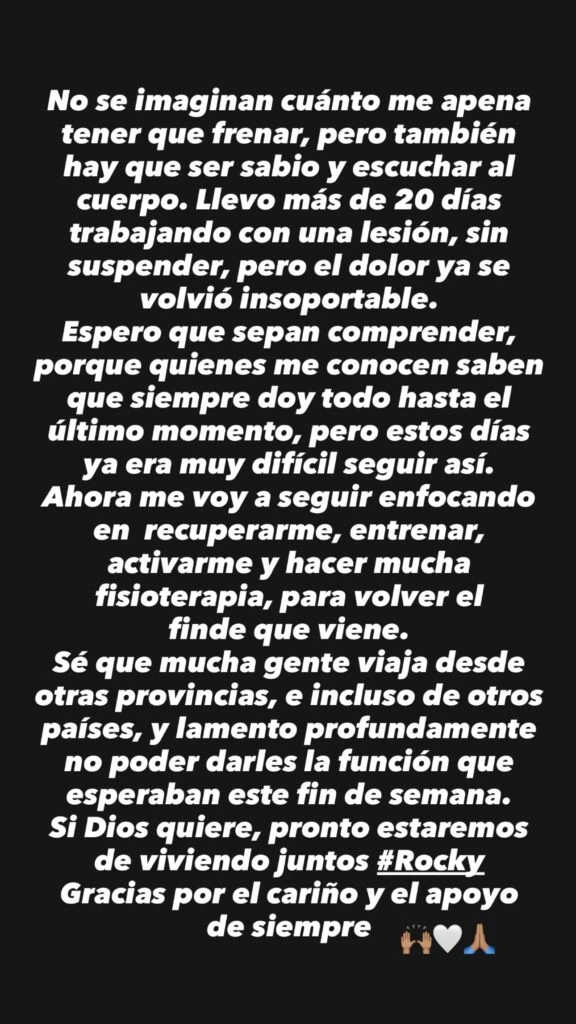 Horas después, el actor se dirigió a sus más de 4 millones de seguidores con un sentido mensaje: “No se imaginan cuánto me apena tener que frenar, pero hay que ser sabio y escuchar al cuerpo. Llevo más de 20 días trabajando con una lesión, sin suspender, pero el dolor ya se volvió insoportable”.