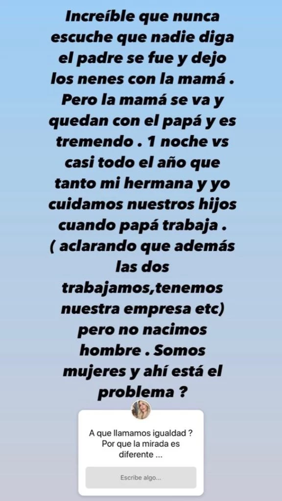 Obviamente, luego de este duro descargo recibió también muchos mensajes de apoyo y seguidores que le pidieron que no se hiciera eco de gente retrógrada que considera que la única responsable de la crianza de los hijos es la mujer.