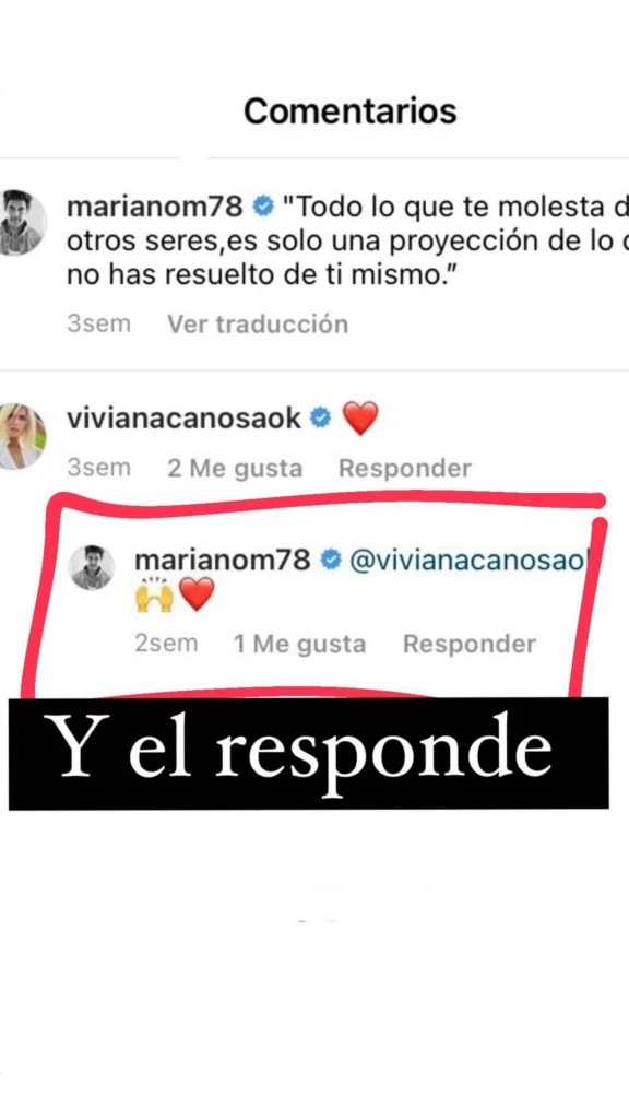 “Todo lo que te molesta de otros seres es solo una proyección de lo que no has resuelto de ti mismo”, escribió el al adjuntar una imagen y ella colocó un corazón. Pero recibió respuesta con el mismo emoji y uno de unas manos.