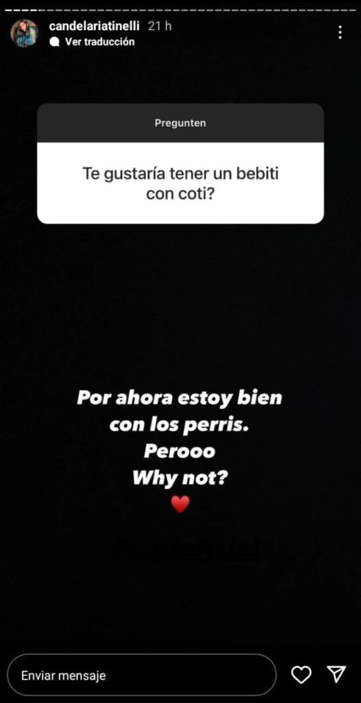 Una de ellas tenía que ver con la posibilidad de formar una familia junto al músico. "¿Te gustaría tener un bebé con Coti?", quiso saber una usuaria. A lo que Cande contestó, sincera: "Por ahora estoy bien con los perris, pero whay not (por qué no)?
