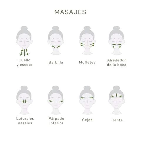 - Contorno de ojos: en dirección ascendente, con fricciones cortas en las zonas de arrugas.