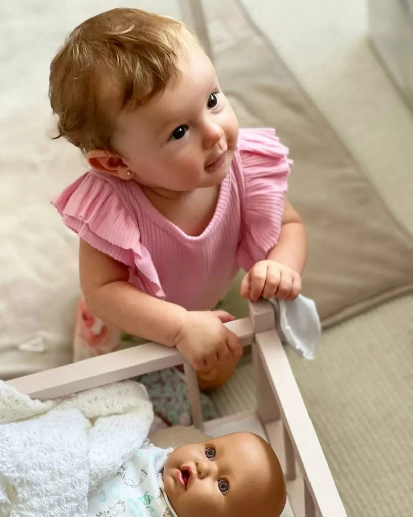 La top model decidió compartir como fue el primer juego de la hija que tuvo con Roberto García Moritán con las muñecas que tiene en su habitación. Sentada en el piso, se puede ver cómo disfruta de una muñeca que está en una cunita de juguete y también cómo intenta ponerle el gorrito a otro bebote que tenía cerca.