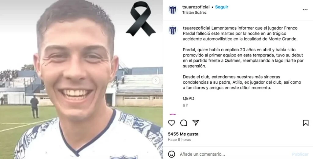 Este martes a la noche, falleció Franco Pardal, futbolista de Tristán Suárez quien tenía sólo 20 años. La noticia fue confirmada por el propio club a través de sus redes sociales. De acuerdo a esta información, el joven chocó con su auto en la localidad de Monte Grande mientras iba por la Avenida Dardo Rocha.