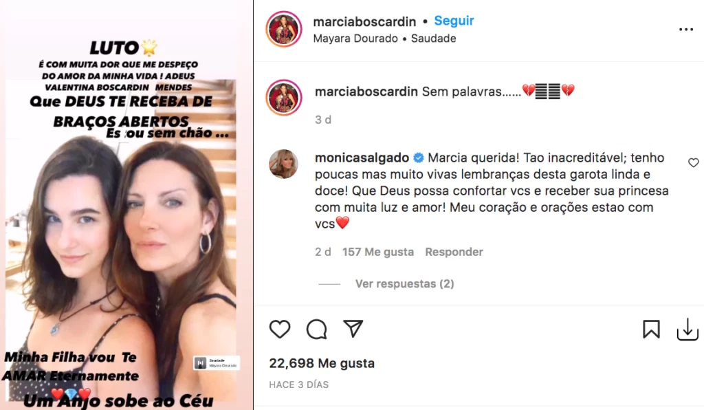 "Con gran dolor me despido del amor de mi vida. Adiós, Valentina Boscardin Mendes. Que Dios te reciba con los brazos abiertos. Hija, siempre te amaré. Un ángel sube al cielo", escribió en su cuenta de Instagram Marcia Boscardin.