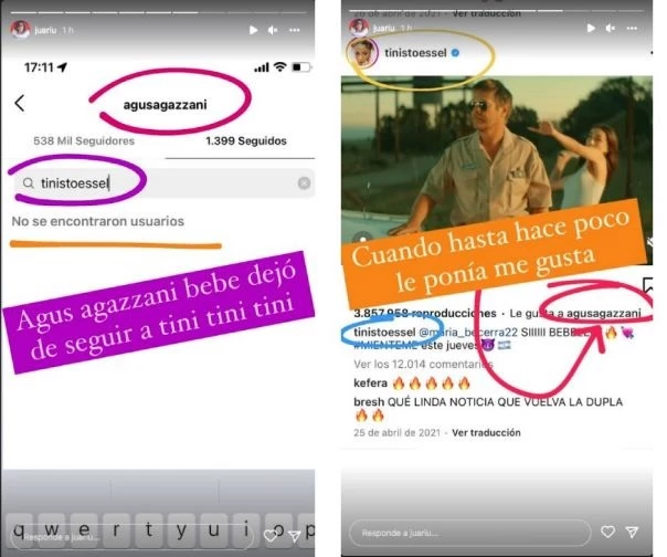 Otro dato que reveló Vicky Braier es que Agustina dejó de seguir a Tini en la red social. "Lo interesante aquí es Agus Agazzani dejó de seguir a Tini. Cuando hasta hace poco le ponía Me gusta", escribió al respecto.