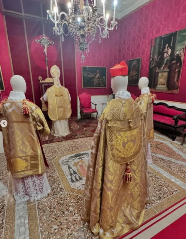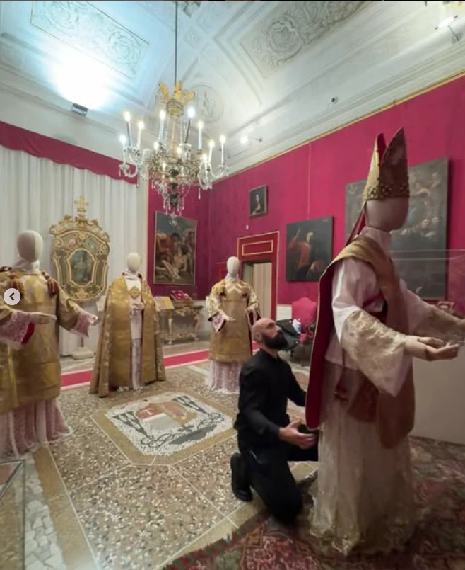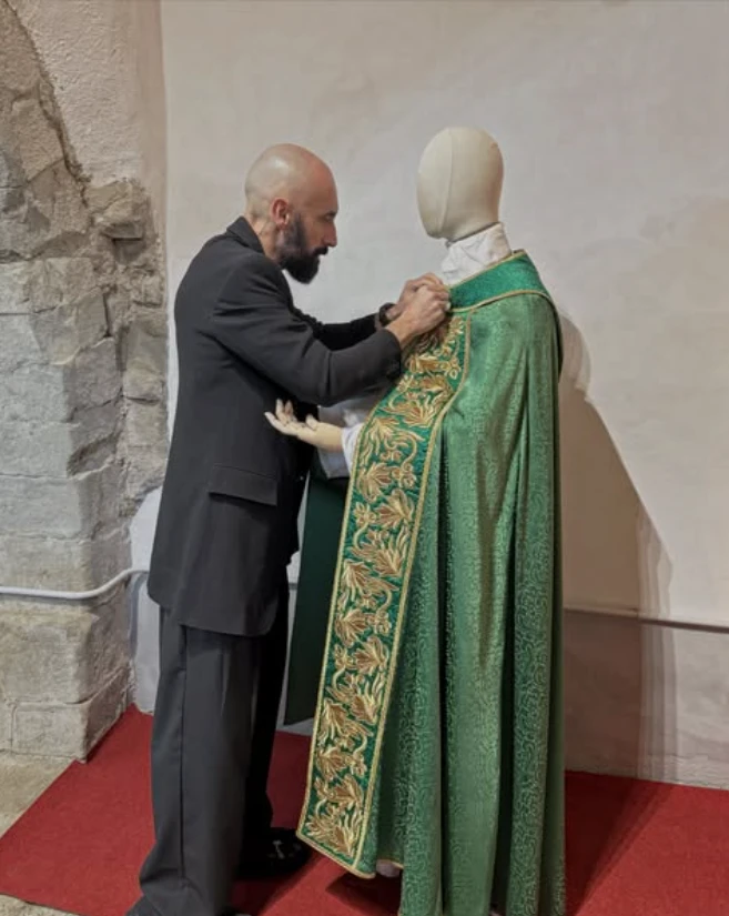 Pero Sorcinelli no solo viste al papa: también propone una nueva forma de vivir la fe. Sus prendas involucran los cinco sentidos. Además de ser visualmente majestuosas y táctilmente ricas, muchas de ellas están impregnadas con un aroma a incienso, diseñado para evocar memorias espirituales profundas