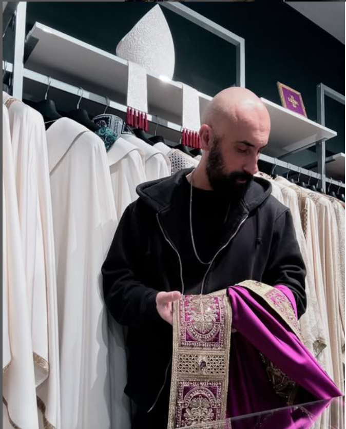 Pero Sorcinelli no solo viste al papa: también propone una nueva forma de vivir la fe. Sus prendas involucran los cinco sentidos. Además de ser visualmente majestuosas y táctilmente ricas, muchas de ellas están impregnadas con un aroma a incienso, diseñado para evocar memorias espirituales profundas