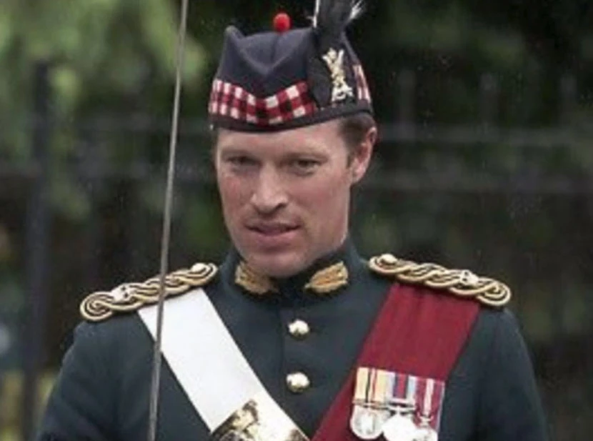 Definido por la prensa británica como "bendecido con una buena apariencia" y siempre vestido con una pollera escocesa, el mayor Jonathan Thompson pertenece al 5° Batallón del Regimiento Real de Escocia fue una vez el caballerizo de mayor confianza de la reina Isabel.