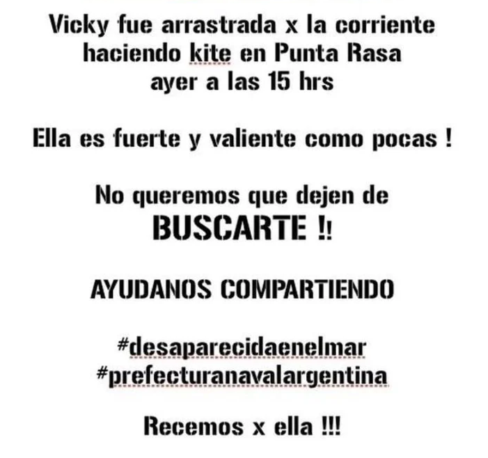 Pero algo pasó, cayó y fue arrastrada por la corriente. Los dos amigos que se encontraban con María Victoria denunciaron que se había hundido y la habían perdido de vista mar adentro, frente a las costas de Punta Rasa. "No queremos dejar de buscarte. Recemos x ella", es el ruego desesperado de sus familiares u amigos.