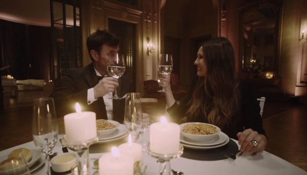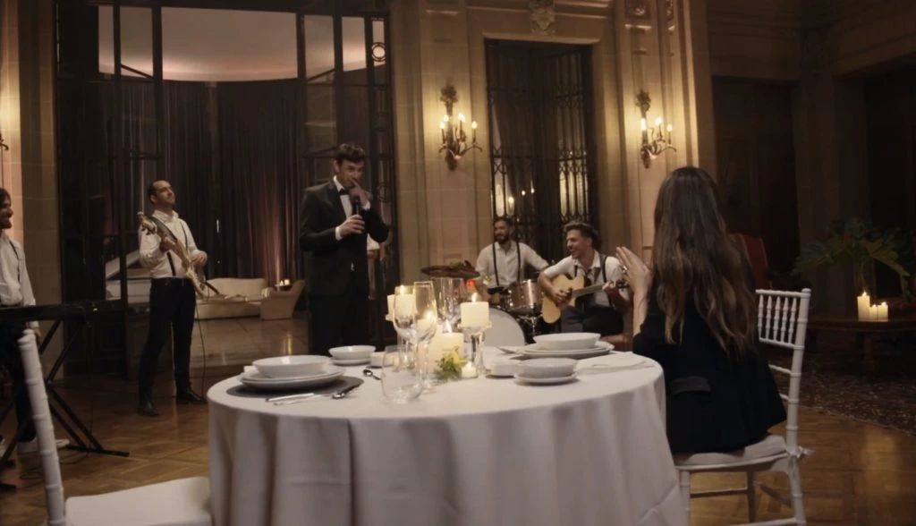 Velas, luz íntima y una mesa para comer a solas... Una banda musicalizó la noche y acompañó a Roberto en el momento cumbre cuando entonó la letra de la canción que compuso especialmente para su mujer. No lo hizo solo: convocó a su amigo Ezequiel Esquiaga, compositor, para entre los dos dar vida a la canción.