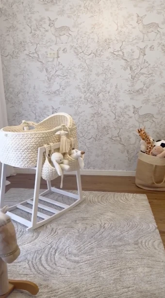 También se puede apreciar un caballito mecedor junto a una cuna decorada con un tejido en color blanco. Por otro lado, las paredes están cubiertas por un papel mural con ilustraciones de bosques, bambis y árboles, inspirado en el espíritu del bosque.
