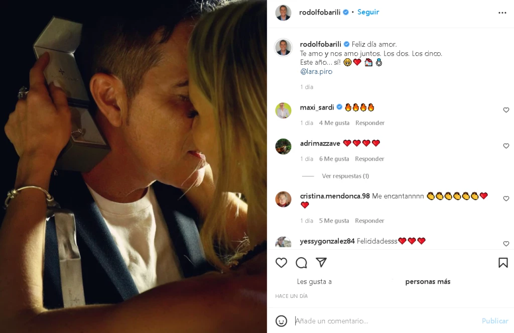 "Feliz día, amor. Te amo y nos amo juntos. Los dos. Los cinco (en referencia a sus dos hijos, Benicio y Dante, y el hijo de Lara, Ladislao). Este año… sí!", expresó Rodolfo Barili sobre sus planes de casamiento con Piro.