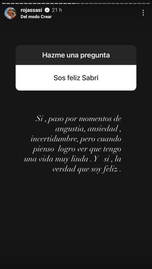 A través de su cuenta de Instagram, Rojas se refirió a este momento que atraviesa, distanciada ya del locutor y conductor y rehaciendo su vida. "Paso por momentos de soledad, angustia, ansiedad, incertidumbre, pero cuando pienso logro ver que tengo una vida muy linda. Y sí, la verdad soy feliz", escribió en sus redes.