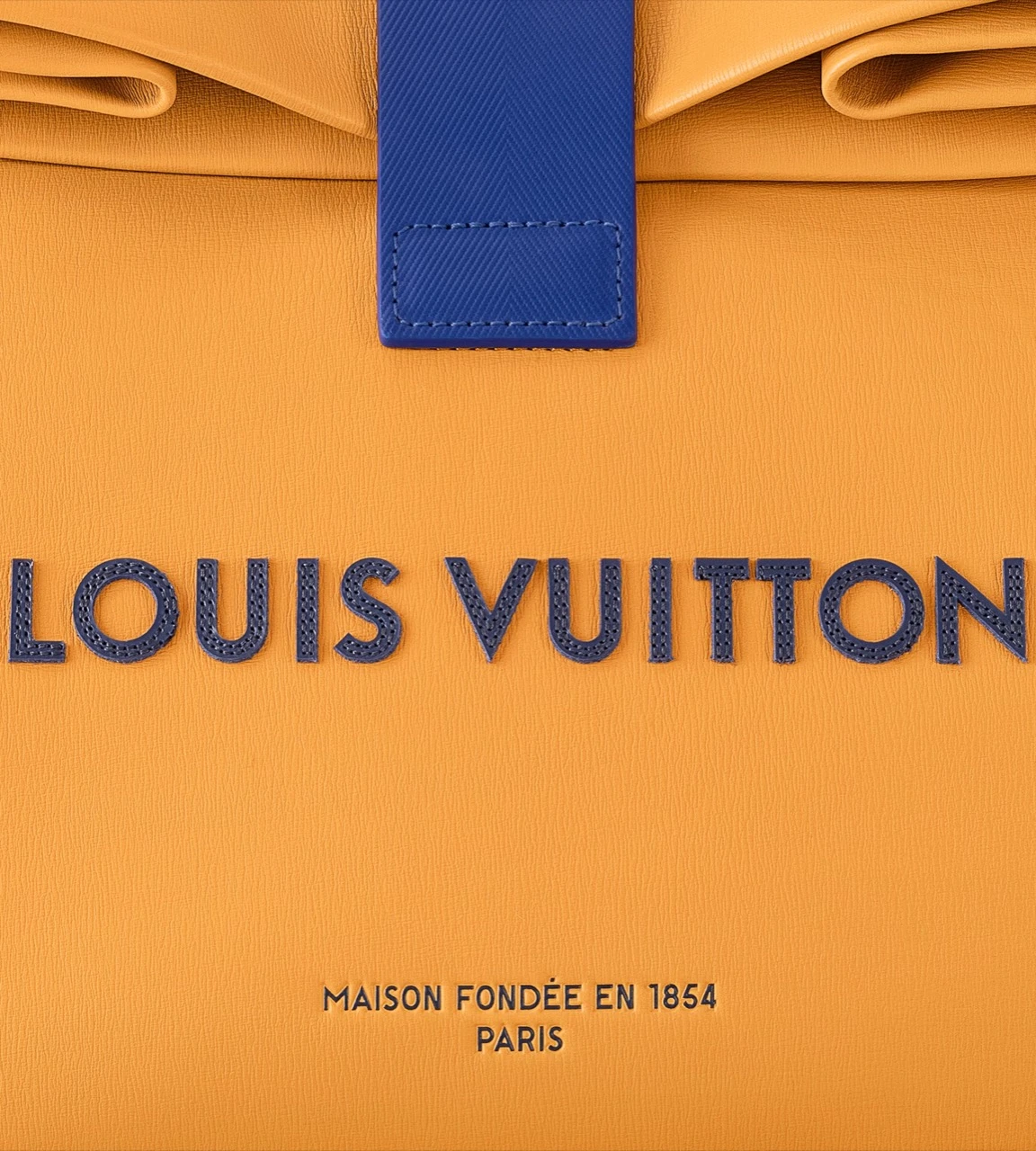 La modelo Anna Ewers llevó el bolso sándwich durante el desfile debut de Pharrell para Louis Vuitton, en París en junio de 2023. Está hecho de cuero, en color camel, doblado, presenta las letras icónicas de Louis Vuitton, y un cierre azul.