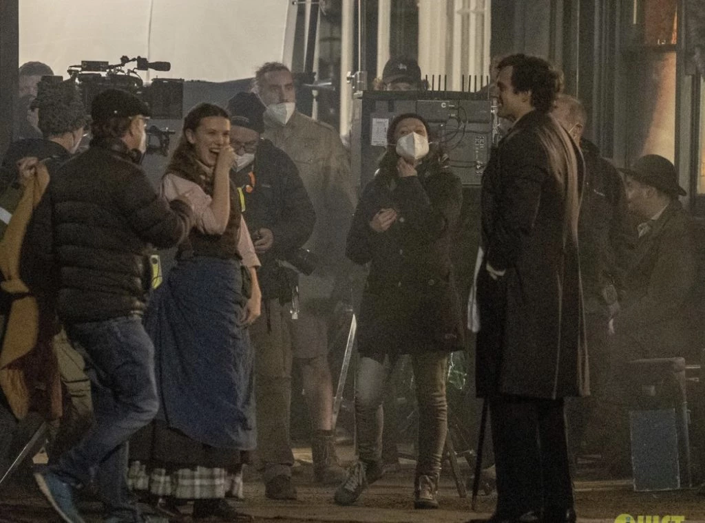 Millie Bobby Brown, quien interpreta a Enola, y Henry Cavill, quien le da vida a esta versión de Sherlock Holmes, fueron fotografiados en el set de grabación. Allí se puede ver a la joven actriz encontrándose con “su hermano” en lo que sería las afueras de un bar.