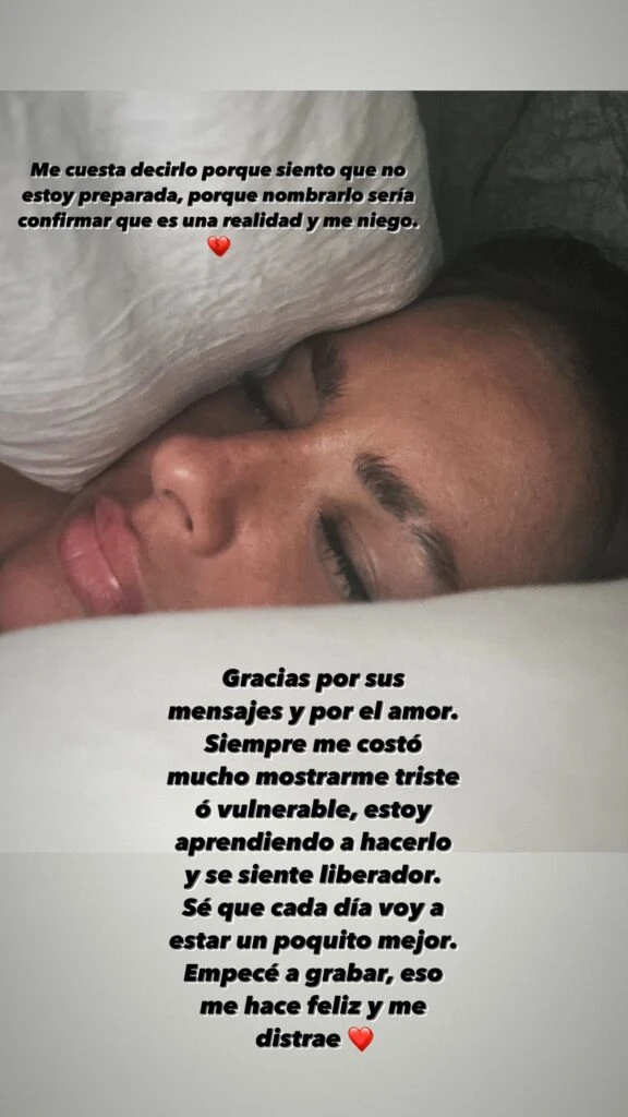 "Están siendo días muy tristes, sólo necesito amor", expresó la actriz por medio de sus redes. Acto seguido, se mostró acompañada del músico Lauty Gram que acudió a apoyar a su pareja. Minutos más tarde, la madre de Rufina, Amancio y Magnolia se fotografió acostada en la cama y con el maquillaje corrido en señal de haber llorado.