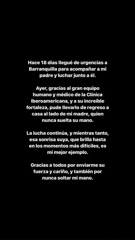 En las últimas horas, Shakira rompió el silencio para dar buenas noticias sobre el hombre, que pasó un duro momento. "Hace 18 días llegué de urgencias a Barranquilla para acompañar a mi padre y luchar junto a él. Ayer gracias al equipo humano y médico de la clínica, y a su increíble fortaleza pude llevarlo de regreso a casa junto a mi madre, quien nunca suelta su mano", expresó en redes.