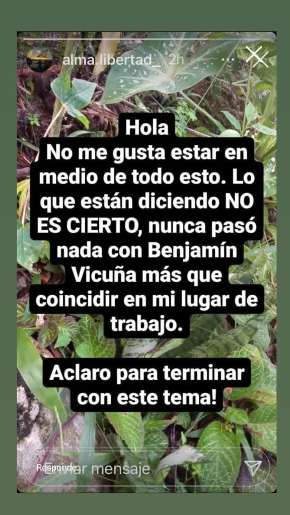 Y en una segunda historia, volvió a referirse al tema: "Hola. No me gusta estar en medio de todo esto. Lo que están diciendo NO ES CIERTO, nunca pasó nada con Benjamín Vicuña, más que coincidir en mi lugar de trabajo. Aclaro para terminar con este tema!", afirmó. Al poco tiempo de subir esta historia, Marianela cerró definitivamente su cuenta de Instagram.