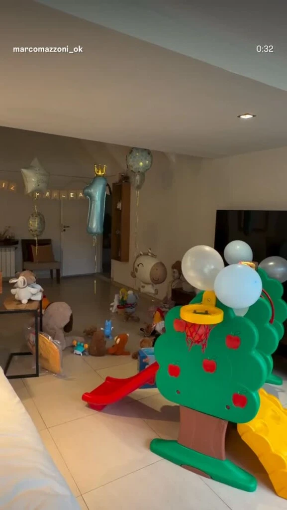 Como se puede apreciar en las imágenes compartidas, el cumpleaños de Marco tuvo una decoración con globos metalizados y en tonos beige. En una de la habitaciones del hogar, se puede observar un cartel de "Feliz cumpleaños", varios peluches de animales entre ellos de la serie Blue y la Granja de Zenón y, un tobogán con un aro para encestar. De esta manera, se puede ver que el pequeño comenzó su día con un festejo familiar, íntimo, con una estética infantil y minimalista sin excesos.