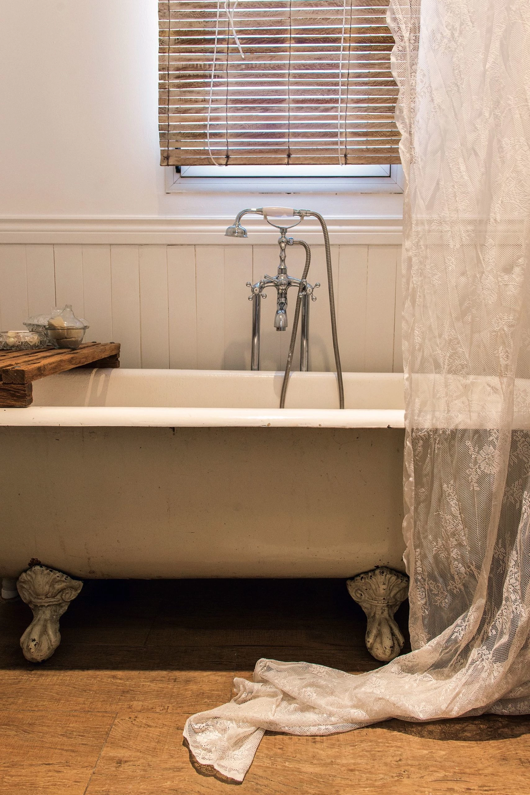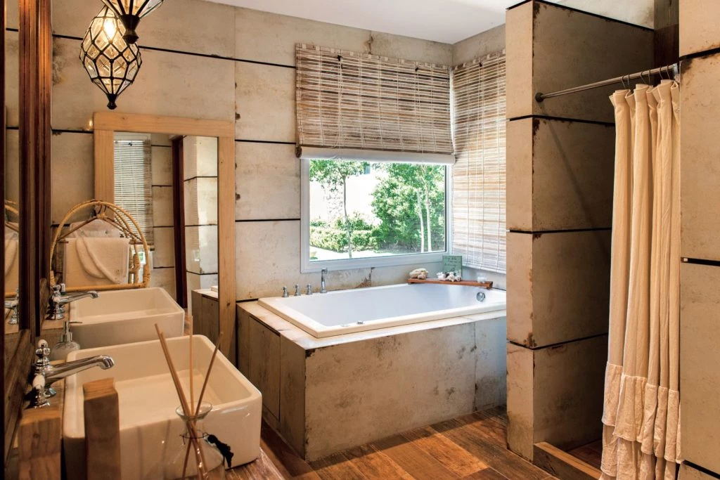 El hidromasaje tiene un cruzabañera de madera (@ce.ce_piume) con recuerdos del mar, caracoles y velas. Difusores (@vachi.byvalelagro). Las cortinas de teca patinadas en blanco, las de gasa rústica con volados de la zona de ducha, junto al espejo de kiri y el toallero de mimbre (@ce.ce_piume) le dan calidez a este baño soñado.