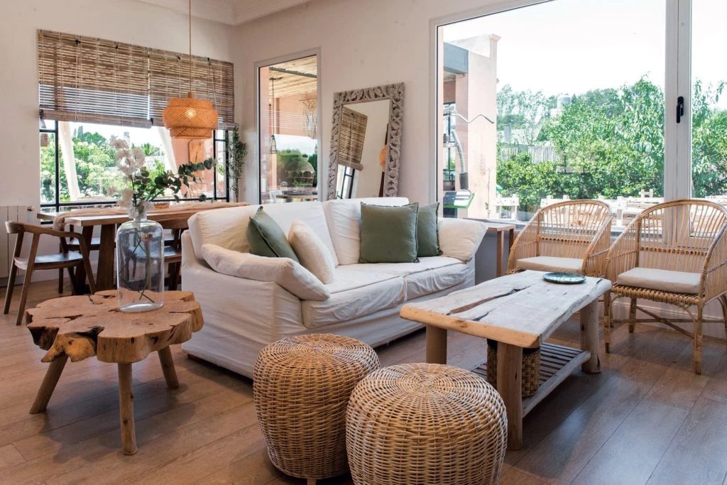 El estilo wabi sabi, que destaca la belleza de lo imperfecto, encuentra eco en esta casa. Se le suman una mesa flor (una rodaja de ciprès con patas de palos de eucalipto), un banco y un marco de durmientes. Alfombra y almohadones con diseños variados (@anotherhomedeco)