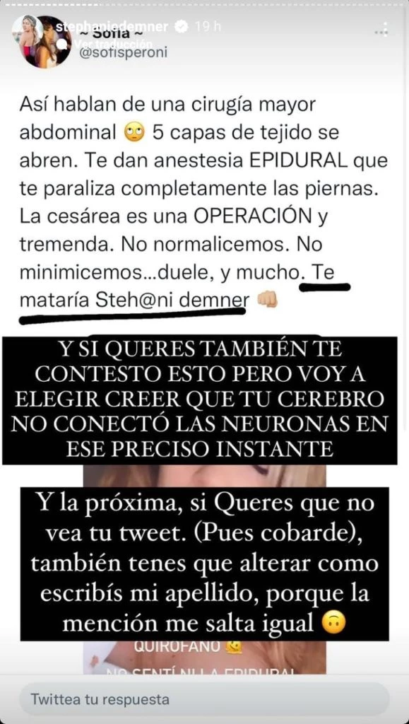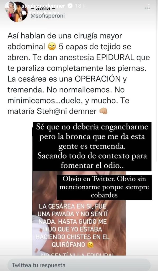 "La cesárea en sí fue una pavada y no sentí nada. Hasta Guido me dijo que estaba haciendo chistes en el quirófano. No sentí ni la epidural", fue la frase que subió Demner a sus redes y que desató algunos comentarios negativos. Entre ellos, los de una usuaria, que twitteó contra las declaraciones de la reciente mamá.