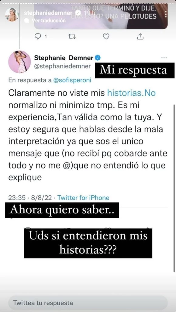 Ante esto, Stephanie le respondió de forma pública, demostrando su enfado. "La bronca que me da esta gente es tremenda. Sacando todo de contexto para generar odio", expresó en Instagram. Y allí justificó sus dichos: "No normalizo ni minimizo tampoco. Es mi experiencia, tan válida como la tuya. Y estoy segura de que hablás desde una mala interpretación", afirmó.