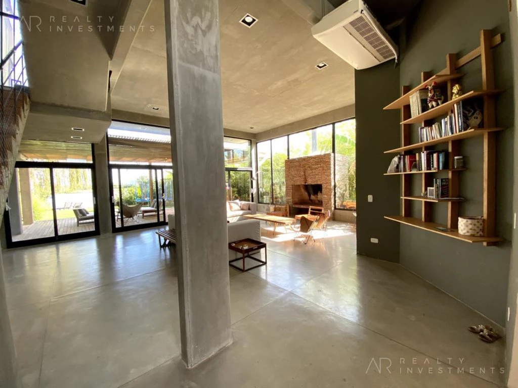 Junto al hall de recepción, está el toilette. El living tiene chimenea y grandes ventanales con vista a la vegetación y la laguna.