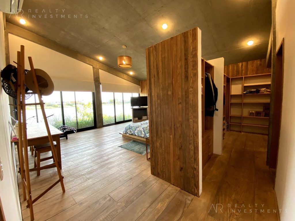 En el piso de arriba, está la master suite con vestidor y vista abierta a la laguna a través de amplios ventanales. El baño es compartimentado con jaccuzzi y box de ducha.